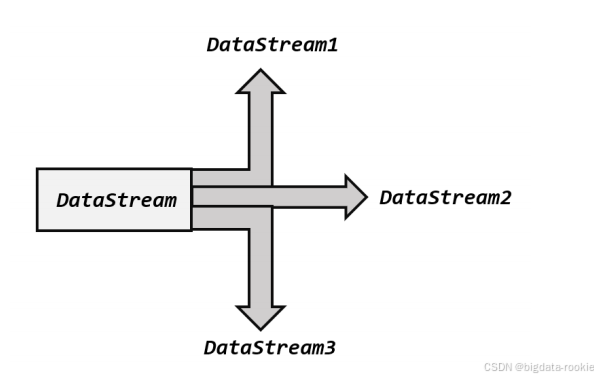 所谓“分流”就是将一条数据流拆分成完全独立的两条、甚至多条流。也就是基于一个 DataStream 得到完全平等的多个子 DataStream,如下图所使。一般会定义一些筛选条件,将符合条件的数据挑选出来,放到对应的流里。
