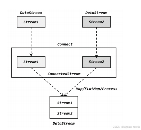 - 基于一条 DataStream 调用 connect() 方法,传入另外一条 DataStream 作为参数,将两条流连接起来,输出一个 ConnectedStream。