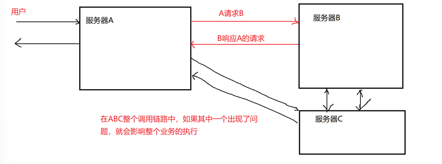 在这个模型中,服务器A和服务器B要时刻互相感知,调用过程中双方都要直到对方需要的参数和调用凡事,此时如果再加入一个服务器节点C,则要直接对接另外的服务器,ABC调用链路中,如果其中一个出了问题,则影响整个业务的执行