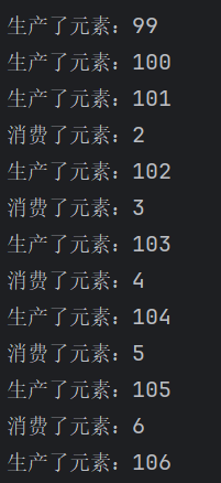 代码中设置阻塞队列的大小为100,设置生产者和消费者两个线程,可以观察到,生产者生成导致队列满后就开始等待消费者消费,消费一个元素后又生成一个元素