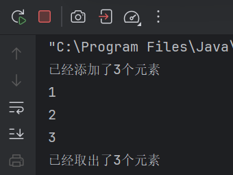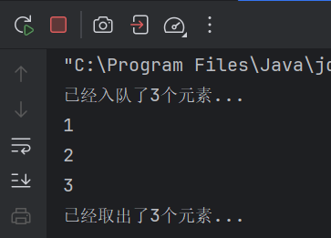 我们再演示取出元素,队列中有1,2,3这三个元素,我们依次取出后,再进行第四次取出,此时不再往下执行,因为队列已经为空,System.out.println(queue.take());阻塞等待