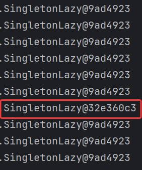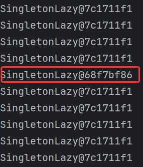 结果显示出现问题,10个打印结果出现了不一致的情况,此时单例模式就不满足单例了