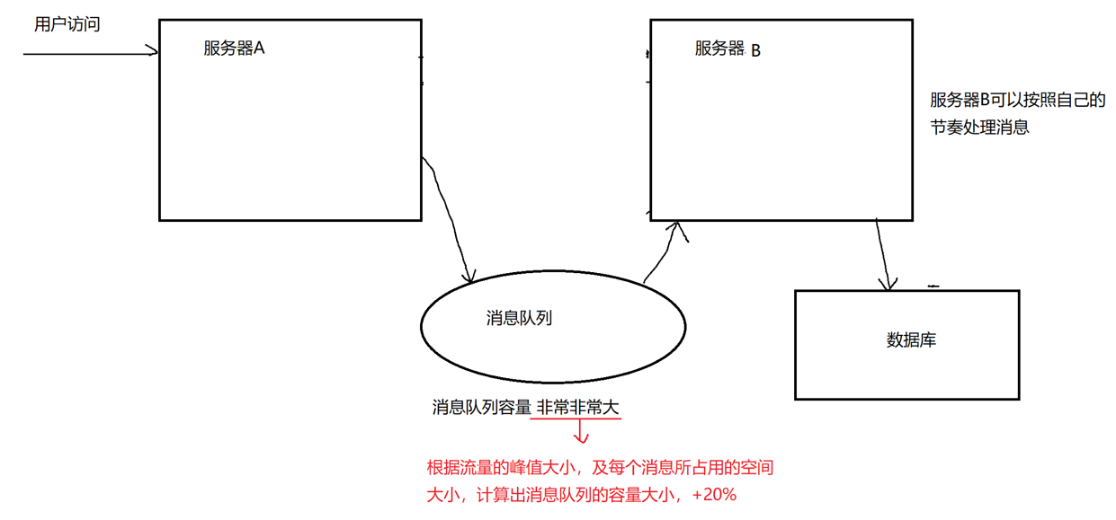 - 消息队列可以接受服务器A的消息并保存,如果队列有空位则入队,队满则阻塞等待