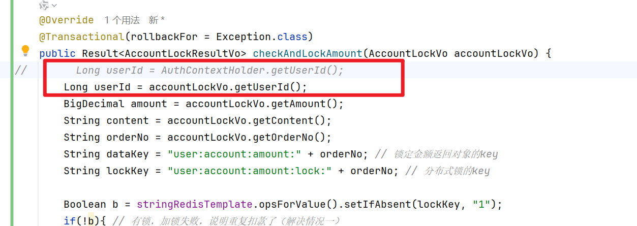 AccountLockVo)传递用户 ID,避免依赖线程上下文。