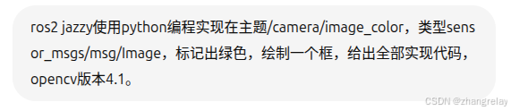 ros2 jazzy使用python编程实现在主题/camera/image_color,类型sensor_msgs/msg/Image,标记出绿色,绘制一个框,给出全部实现代码,opencv版本4.1。