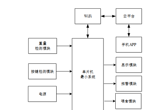 根据系统设计功能,展开系统方案设计,如图2.1所示为宠物喂食器总体架构,系统选用STC12C5A16S2作为核心控制器,通过HX711传感器实现剩余食物重量检测,当实物重量不足可以通过蜂鸣器进行报警提示,并且用户可以通过按键