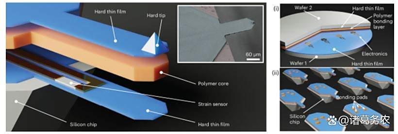 聚合物悬臂梁:SU-8核心层(模量~4GPa)夹于Si₃N₄层间,实现高柔性与自感知集成,力噪声比硅基降低6倍。