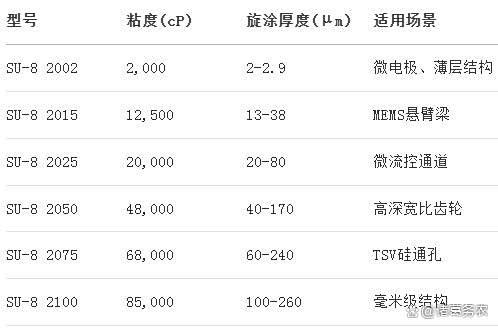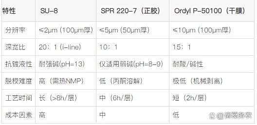 SU-8在厚胶光刻领域具有显著优势,但也面临特定挑战,需根据应用需求选择替代材料: