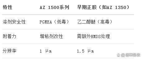 AZ 1500系列作为经典G线正胶,通过树脂馏分精细化(如HS型号)与溶剂环保化(PGMEA体系)持续迭代,在成熟制程半导体、光学防伪及MEMS领域保持不可替代性。未来发展聚焦两大方向: