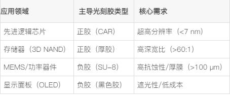 负胶在 先进封装(2.5D/3D IC)、MEMS、显示面板领域占比将提升至65%以上。正胶继续主导 高端逻辑/存储芯片制造(市占率>90%)。双性胶可能在小众领域(如光子芯片)实现突破,但无法取代单性胶主体地位。