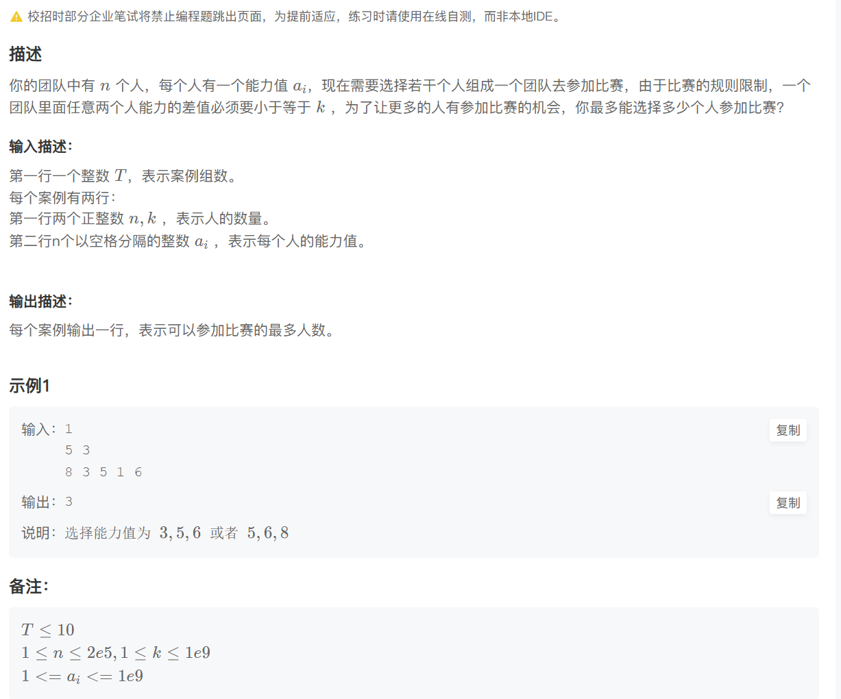 你的团队中有 n 个人,每个人有一个能力值 ai,现在需要选择若干个人组成一个团队去参加比赛,由于比赛的规则限制,一个团队里面任意两个人能力的差值必须要小于等于 k ,为了让更多的人有参加比赛的机会,你最多能选择多少个人参加比赛?