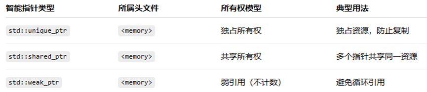 如果忘记 delete,就会导致内存泄漏;如果多次delete,就会产生悬空指针或程序崩溃。为了解决这些问题,C++11 引入了智能指针类,它能在对象不再使用时自动释放内存,从而减少内存泄漏、悬空指针等错误。