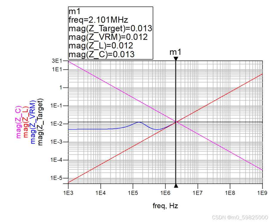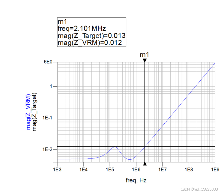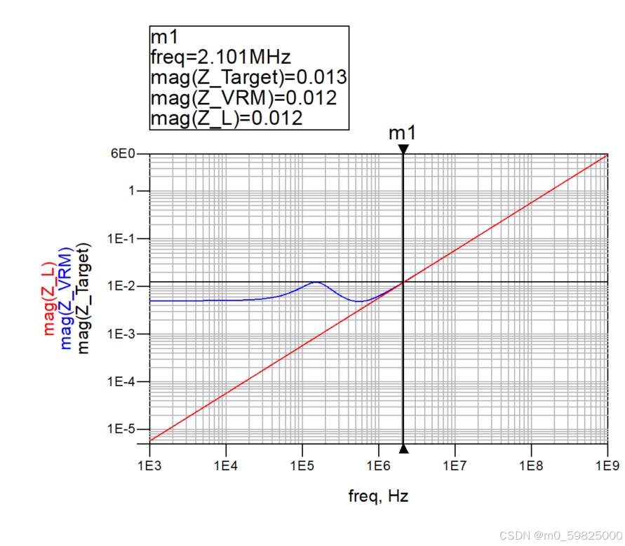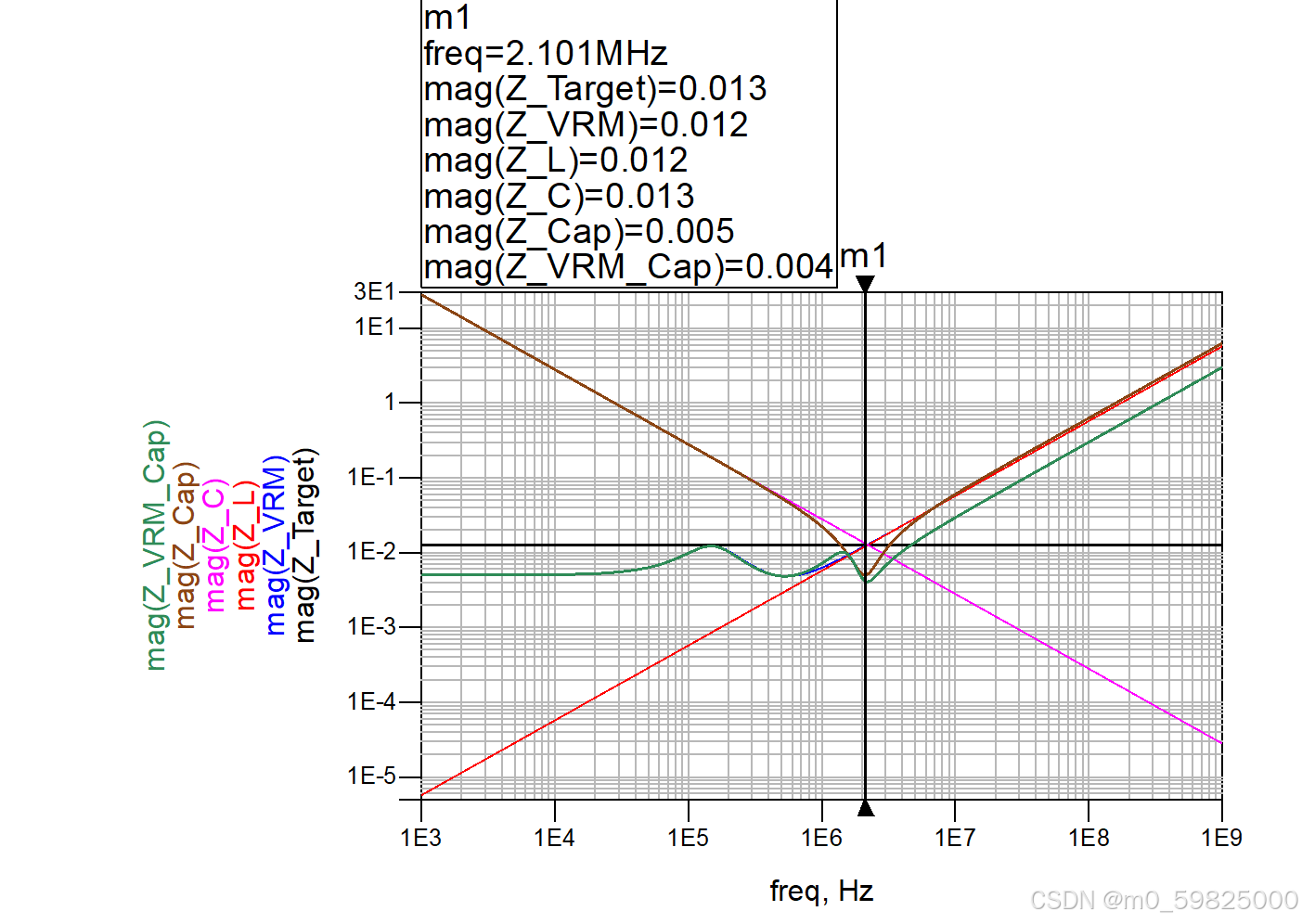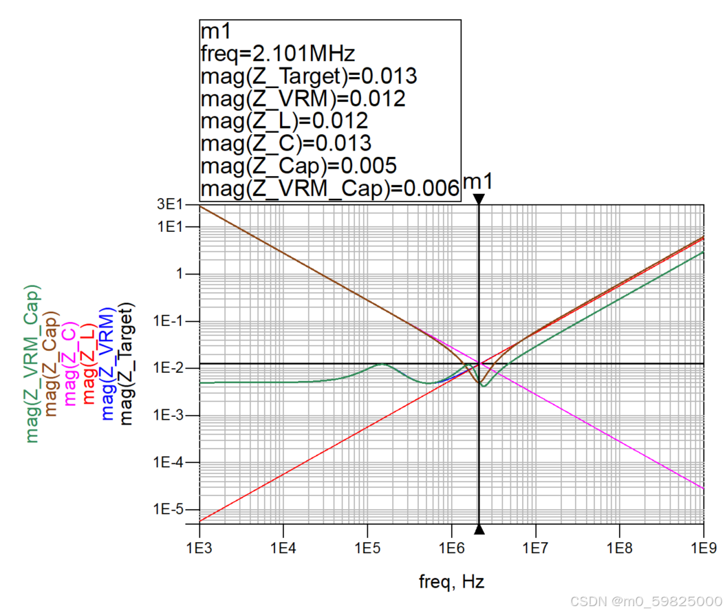 在下面VRM中,阻抗曲线如图所示,其目标阻抗用黑线标出,目标阻抗为12.5mOhm: