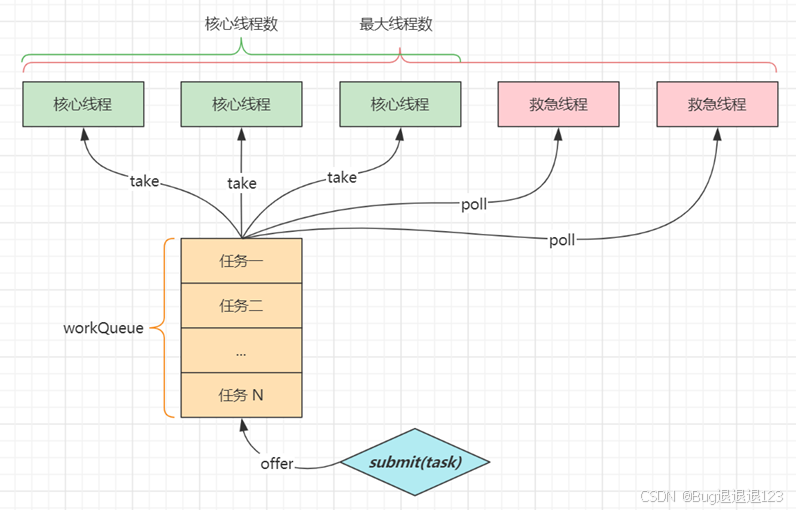 线程池中,不仅仅有核心线程,还有救急线程,即任务进来后,核心线程处理不过来时才会创建救急线程,救急线程的数目 = maximumPoolSize - corePoolSize。