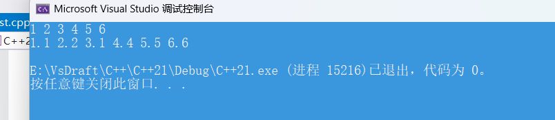 {vector<int>v1 = { 1,2,3,4,5,6 };vector<double>v2 = { 1.1,2.2,3.1,4.4,5.5,6.6 };VectorPrint(v1);VectorPrint(v2);}