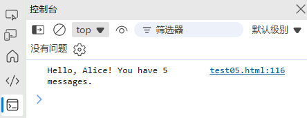 console.log(result); // "Hello, Alice! You have 5 messages."