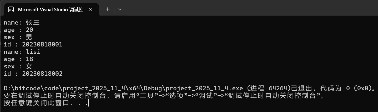 "⼥" };printf("name: %s\n", s2.name);printf("age : %d\n", s2.age);printf("sex : %s\n", s2.sex);printf("id : %s\n", s2.id);return 0;