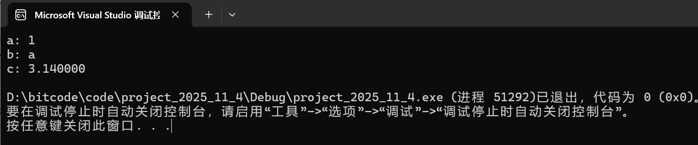 {printf("a: %d\n", x.a);printf("b: %c\n", x.b);printf("c: %f\n", x.c);return 0;
