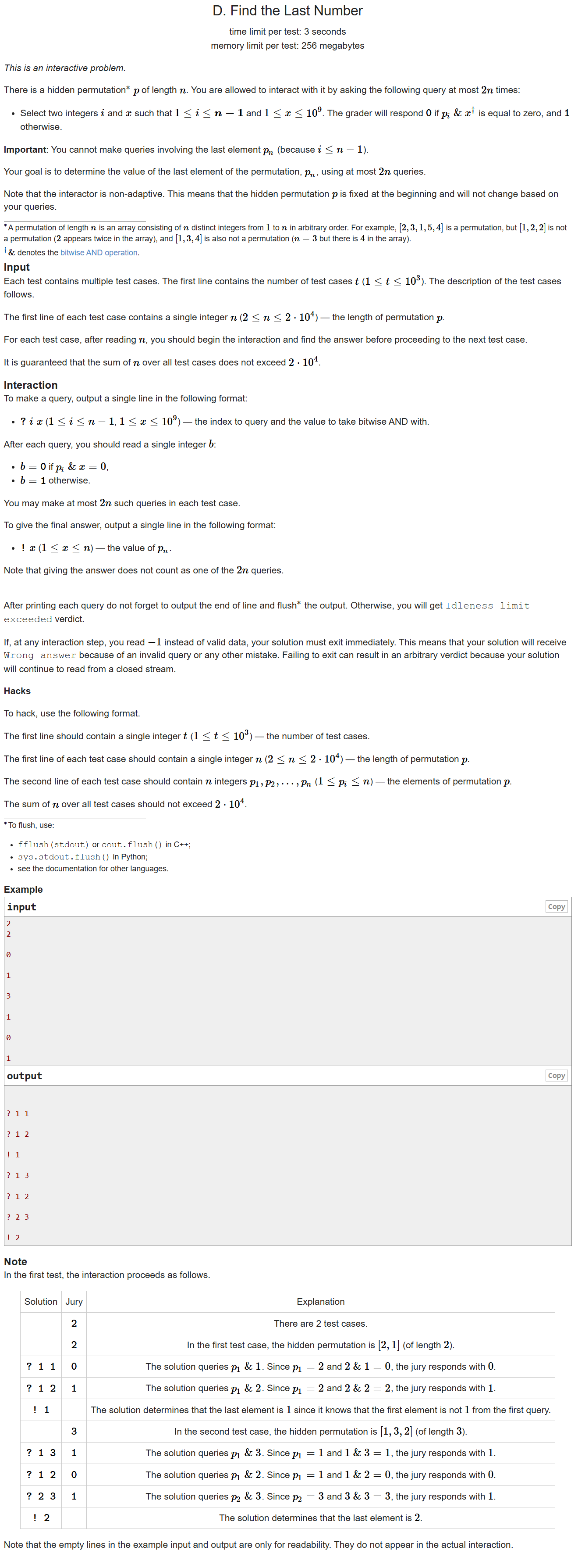 bool num[N],id[N];void solve(){cin>>n;for(int i=1;i<=n;i++)num[i]=id[i]=false;int r=1;while(1){int x1,x2;x1=x2=0;for(int i=1;i<=n;i++){if(num[i])continue;if((i&r))x1++;elsex2++;}if(x1+x2==1)break;vector<int>c1,c2;for(int i=1;i<n;i++){if(id[i])continue;if(print(i,r)){x1--;c1.push_back(i);}else{x2--;c2.push_back(i);}}if(!x1){//说明 最后一位 第 k位为0for(int i=1;i<=n;i++)if((i&r))num[i]=true;for(auto a:c1)id[a]=true;}else {for(int i=1;i<=n;i++)if(!(i&r))num[i]=true;for(auto a:c2)id[a]=true;}r*=2;}for(int i=1;i<=n;i++)if(!num[i]){cout<<"! "<<i<<'\n';return ;}
