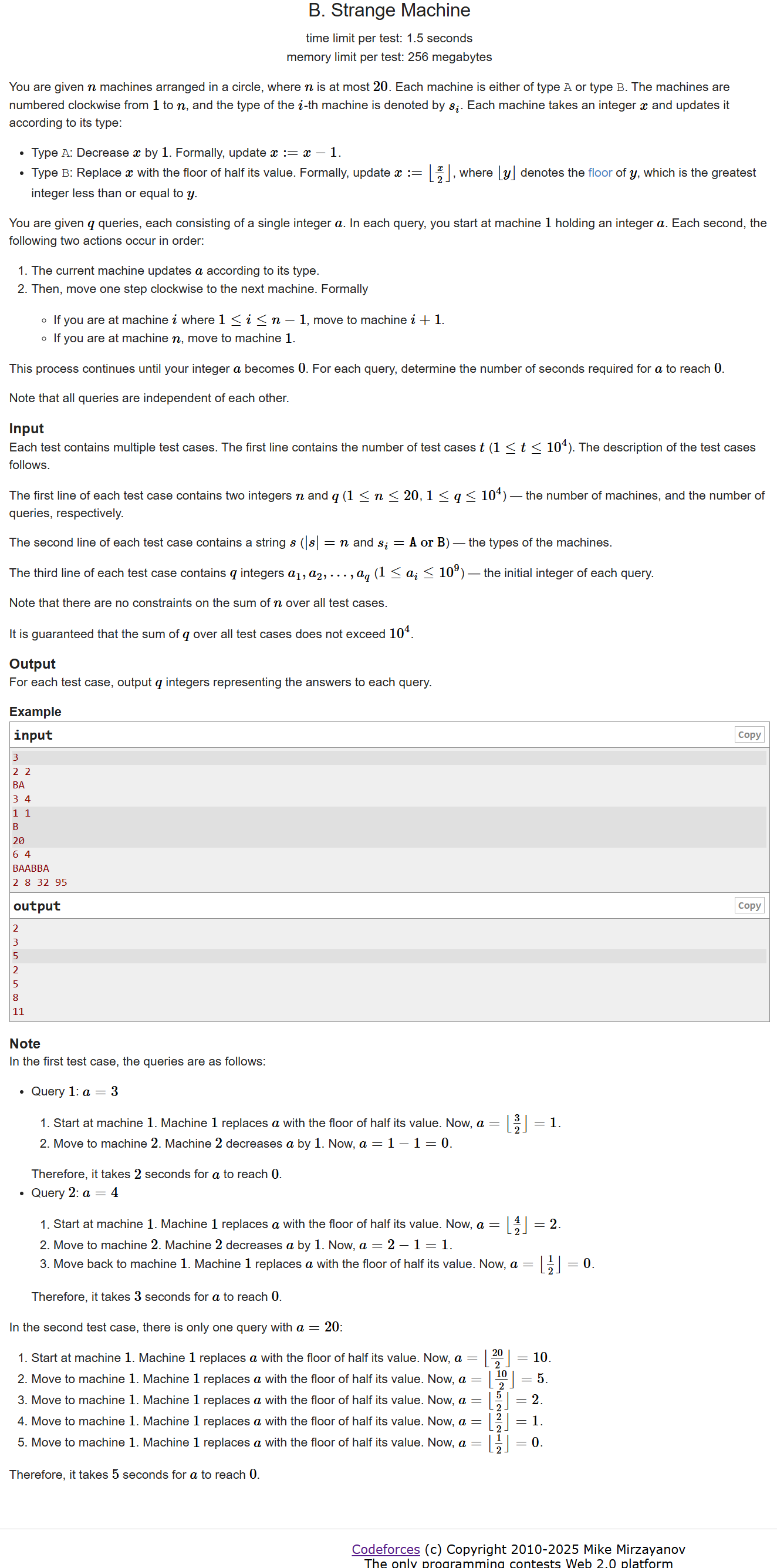 void solve(){cin>>n>>q;cin>>s;bool r=false;for(auto c:s){if(c=='B')r=true;}while(q--){int x;cin>>x;if(!r){cout<<x<<'\n';continue;}int id=0;int cnt=0;while(x){if(s[id]=='A')x--;elsex/=2;cnt++;id=(id+1)%n;}cout<<cnt<<'\n';}