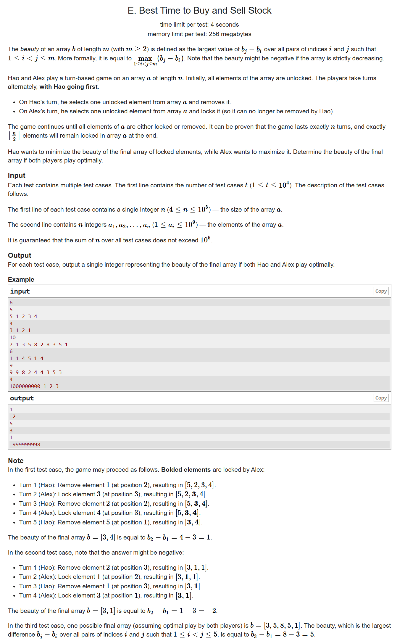 int n;bool check(ll x){for(int i=1;i<=n;i++)eg[i].clear();vector<PII>cun;for(int i=1;i<=n;i++){for(auto [val,id]:cun){if(a[i]-val>=x){eg[i].push_back(id);eg[id].push_back(i);}}cun.push_back({a[i],i});sort(cun.begin(),cun.end());if(cun.size()>3)cun.pop_back();} int cnt=0;for(int i=1;i<=n;i++)if(eg[i].size()>=2)cnt++;for(int i=1;i<=n;i++){int res=eg[i].size()>=2;for(auto v:eg[i]){if(eg[v].size()==2)res++;}if(res==cnt)return false;}return true;