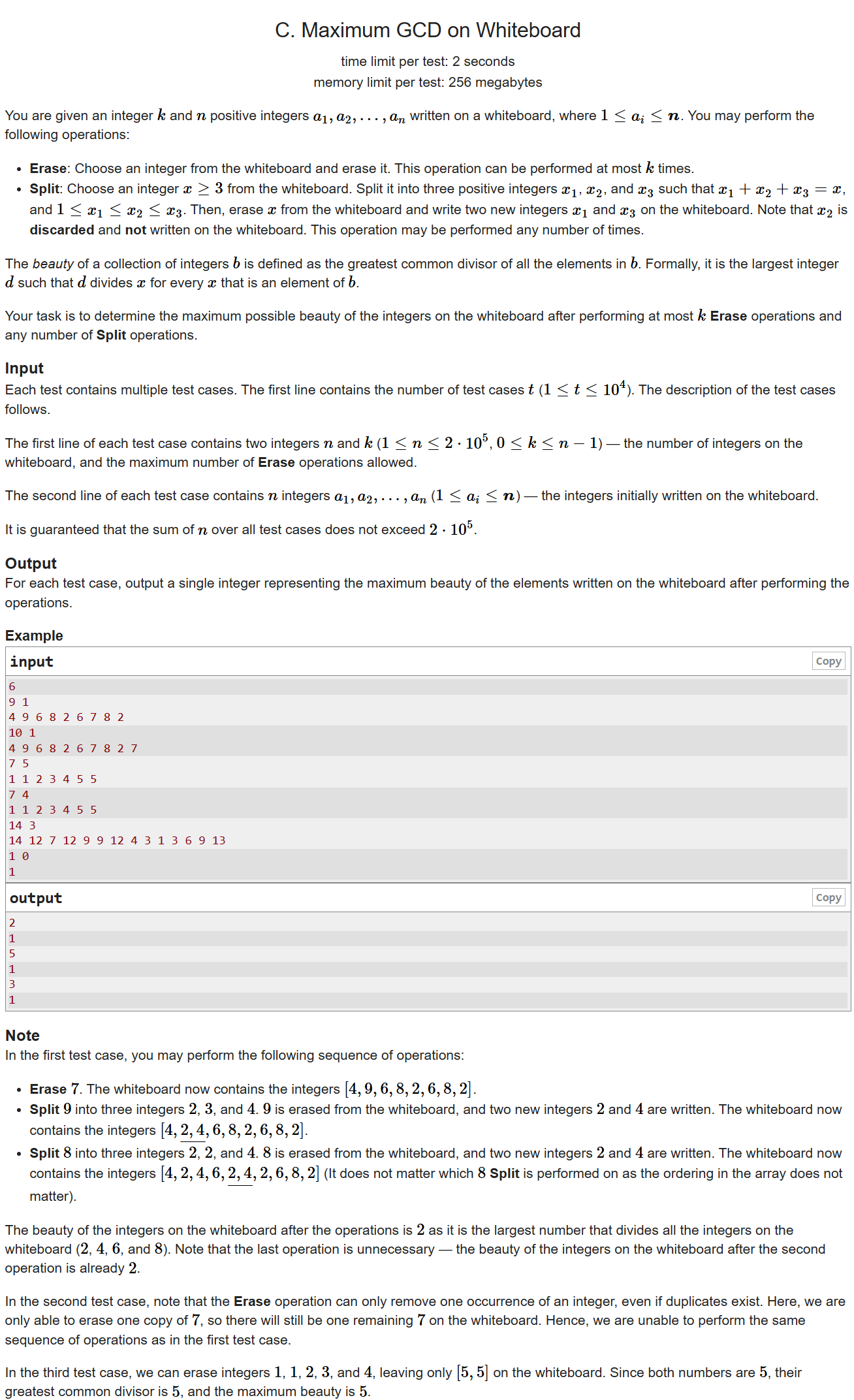 void solve(){for(int i=1;i<=4*n;i++)a[i]=sum[i]=0;cin>>n>>k;int ans=1;for(int i=1;i<=n;i++){int x;cin>>x;a[x]++;}for(int i=1;i<=4*n;i++)sum[i]=sum[i-1]+a[i];for(int i=1;i<=n;i++){int s=sum[4*i-1];s-=a[i]+a[2*i]+a[3*i];if(s<=k)ans=max(ans,i);}cout<<ans<<'\n';