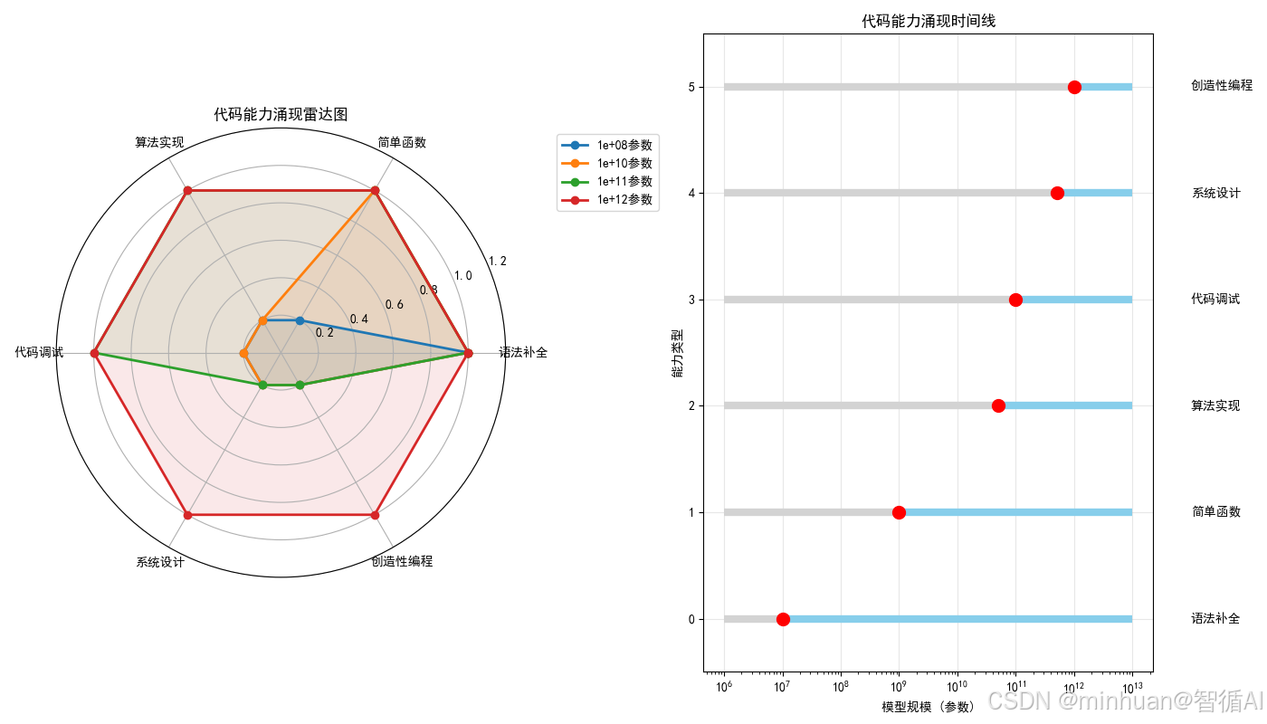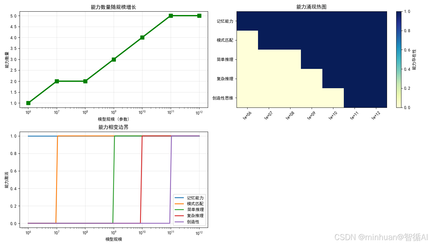 plt.rcParams['axes.unicode_minus'] = Falseclass EmergencePhaseTransition:"""涌现能力的相变理论分析"""def __init__(self):self.capabilities = {'memorization': '记忆能力','pattern_matching': '模式匹配', 'simple_reasoning': '简单推理','complex_reasoning': '复杂推理','creativity': '创造性思维'}def analyze_phase_transition(self, model_size):"""分析不同规模下的能力相变"""if model_size < 1e7: # 1000万参数return ['memorization']elif model_size < 1e9: # 10亿参数return ['memorization', 'pattern_matching']elif model_size < 1e10: # 100亿参数return ['memorization', 'pattern_matching', 'simple_reasoning']elif model_size < 1e11: # 1000亿参数return ['memorization', 'pattern_matching', 'simple_reasoning', 'complex_reasoning']else: # 万亿参数return ['memorization', 'pattern_matching', 'simple_reasoning', 'complex_reasoning', 'creativity']def plot_capability_emergence(self):"""绘制能力涌现图谱"""sizes = [1e6, 1e7, 1e8, 1e9, 1e10, 1e11, 1e12]capabilities_count = [len(self.analyze_phase_transition(size)) for size in sizes]plt.figure(figsize=(14, 8))# 绘制能力数量变化plt.subplot(2, 2, 1)plt.semilogx(sizes, capabilities_count, 'g-s', linewidth=3, markersize=8)plt.xlabel('模型规模 (参数)')plt.ylabel('能力数量')plt.title('能力数量随规模增长')plt.grid(True, alpha=0.3)# 绘制能力热图plt.subplot(2, 2, 2)capability_matrix = []for size in sizes:capabilities = self.analyze_phase_transition(size)row = [1 if cap in capabilities else 0 for cap in self.capabilities.keys()]capability_matrix.append(row)capability_matrix = np.array(capability_matrix)plt.imshow(capability_matrix.T, cmap='YlGnBu', aspect='auto')plt.yticks(range(len(self.capabilities)), [self.capabilities[cap] for cap in self.capabilities.keys()])plt.xticks(range(len(sizes)), [f'{size:.0e}' for size in sizes], rotation=45)plt.title('能力涌现热图')plt.colorbar(label='能力存在性')# 绘制相变边界plt.subplot(2, 2, 3)x = np.logspace(6, 12, 100)y_memory = np.ones_like(x)y_pattern = np.where(x >= 1e7, 1, 0)y_simple = np.where(x >= 1e9, 1, 0)y_complex = np.where(x >= 1e10, 1, 0)y_creative = np.where(x >= 1e11, 1, 0)plt.semilogx(x, y_memory, label='记忆能力', linewidth=2)plt.semilogx(x, y_pattern, label='模式匹配', linewidth=2)plt.semilogx(x, y_simple, label='简单推理', linewidth=2)plt.semilogx(x, y_complex, label='复杂推理', linewidth=2)plt.semilogx(x, y_creative, label='创造性', linewidth=2)plt.xlabel('模型规模')plt.ylabel('能力激活')plt.title('能力相变边界')plt.legend()plt.grid(True, alpha=0.3)plt.tight_layout()plt.show()# 运行相变分析