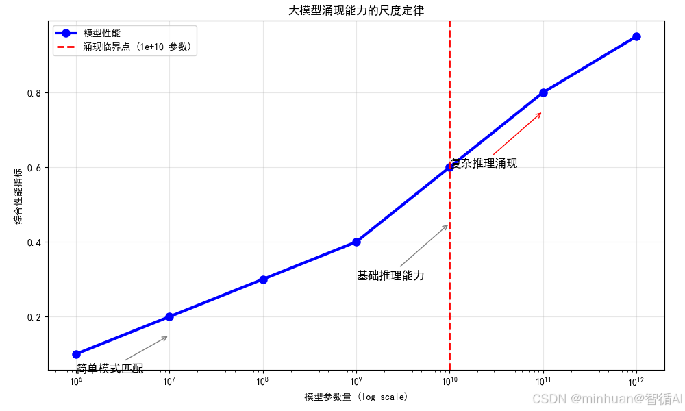 plt.rcParams['axes.unicode_minus'] = Falsedef scaling_laws_visualization():"""尺度定律可视化:性能随规模增长的变化"""# 模拟不同规模下的模型性能model_sizes = [1e6, 1e7, 1e8, 1e9, 1e10, 1e11, 1e12] # 参数量performance = [0.1, 0.2, 0.3, 0.4, 0.6, 0.8, 0.95] # 性能指标# 临界点位置(涌现开始)emergence_point = 1e10 # 约100亿参数plt.figure(figsize=(10, 6))plt.tight_layout()# 绘制性能曲线plt.semilogx(model_sizes, performance, 'b-o', linewidth=3, markersize=8, label='模型性能')# 标记涌现临界点plt.axvline(x=emergence_point, color='red', linestyle='--', linewidth=2, label=f'涌现临界点 ({emergence_point:.0e} 参数)')# 标注不同阶段plt.annotate('简单模式匹配', xy=(1e7, 0.15), xytext=(1e6, 0.05),arrowprops=dict(arrowstyle='->', color='gray'), fontsize=12)plt.annotate('基础推理能力', xy=(1e10, 0.45), xytext=(1e9, 0.3),arrowprops=dict(arrowstyle='->', color='gray'), fontsize=12)plt.annotate('复杂推理涌现', xy=(1e11, 0.75), xytext=(1e10, 0.6),arrowprops=dict(arrowstyle='->', color='red'), fontsize=12)plt.xlabel('模型参数量 (log scale)')plt.ylabel('综合性能指标')plt.title('大模型涌现能力的尺度定律')plt.legend()plt.grid(True, alpha=0.3)plt.subplots_adjust(left=0.07, right=0.97, top=0.95, bottom=0.1)plt.show()# 运行可视化