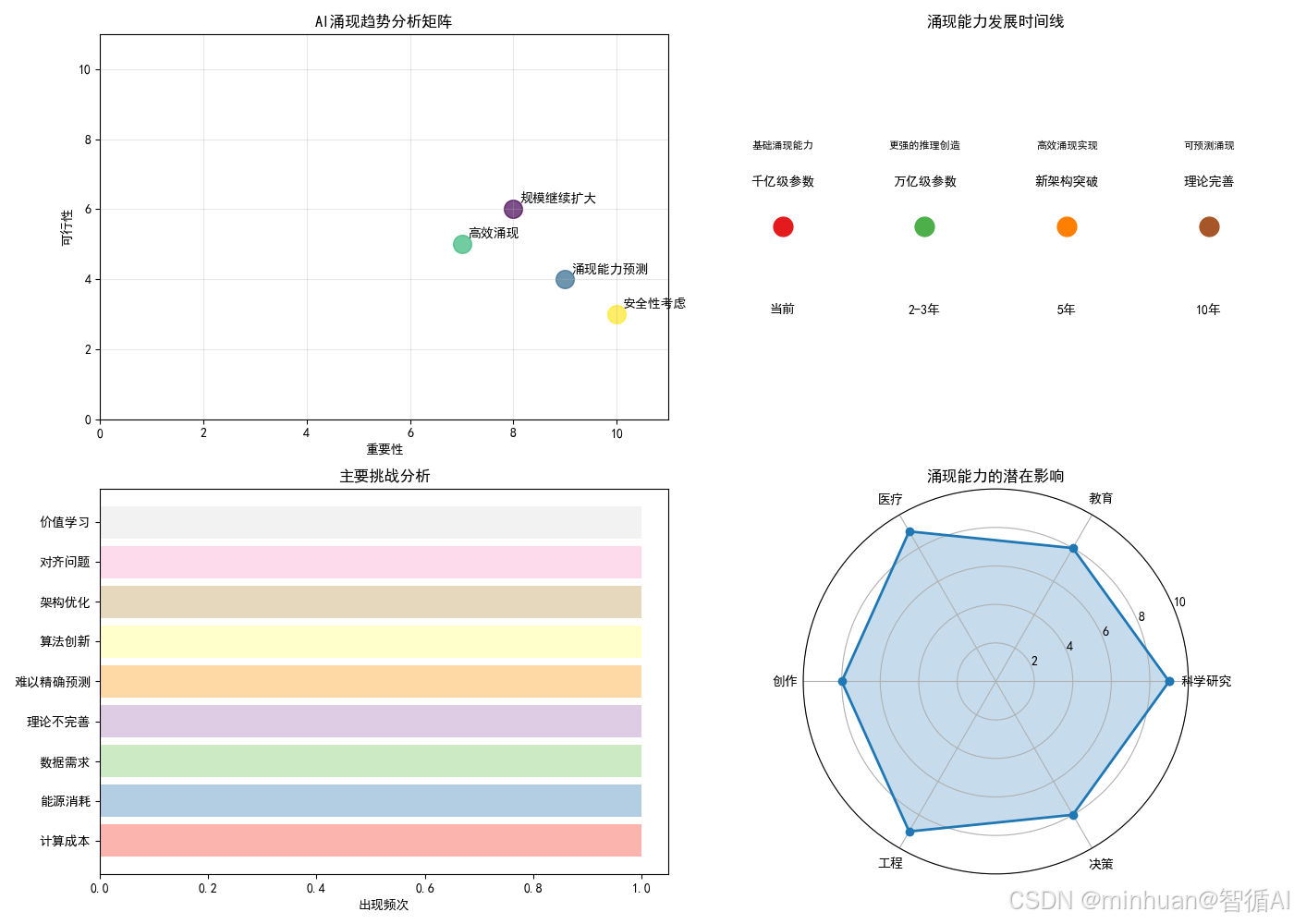 plt.rcParams['axes.unicode_minus'] = Falseclass EmergenceImplications:"""涌现能力对AI发展的启示分析"""def analyze_future_trends(self):"""分析未来发展趋势"""trends = {'scaling_continuation': {'name': '规模继续扩大','description': '模型参数向万亿、十万亿级别发展','potential': '可能出现更强的推理和创造能力','challenges': ['计算成本', '能源消耗', '数据需求']},'emergence_prediction': {'name': '涌现能力预测', 'description': '提前预测新能力的出现','potential': '针对性优化和安全性准备','challenges': ['理论不完善', '难以精确预测']},'efficient_emergence': {'name': '高效涌现','description': '用更小规模实现涌现能力','potential': '降低部署成本,扩大应用范围','challenges': ['算法创新', '架构优化']},'safety_considerations': {'name': '安全性考虑','description': '应对不可预测的涌现行为','potential': '确保AI系统安全可靠','challenges': ['对齐问题', '价值学习']}}# 可视化趋势分析plt.figure(figsize=(14, 10))# 趋势重要性矩阵plt.subplot(2, 2, 1)importance = [8, 9, 7, 10] # 重要性评分feasibility = [6, 4, 5, 3] # 可行性评分colors = plt.cm.viridis(np.linspace(0, 1, len(trends)))for i, (trend_key, trend_info) in enumerate(trends.items()):plt.scatter(importance[i], feasibility[i], s=200, color=colors[i], label=trend_info['name'], alpha=0.7)plt.annotate(trend_info['name'], (importance[i], feasibility[i]), xytext=(5, 5), textcoords='offset points')plt.xlabel('重要性')plt.ylabel('可行性')plt.title('AI涌现趋势分析矩阵')plt.xlim(0, 11)plt.ylim(0, 11)plt.grid(True, alpha=0.3)# 时间线预测plt.subplot(2, 2, 2)milestones = [('当前', '千亿级参数', '基础涌现能力'),('2-3年', '万亿级参数', '更强的推理创造'),('5年', '新架构突破', '高效涌现实现'),('10年', '理论完善', '可预测涌现')]for i, (time, achievement, description) in enumerate(milestones):plt.plot(i, 0, 'o', markersize=15, color=plt.cm.Set1(i/len(milestones)))plt.text(i, -0.2, time, ha='center', va='top')plt.text(i, 0.1, achievement, ha='center', va='bottom', fontweight='bold')plt.text(i, 0.2, description, ha='center', va='bottom', fontsize=8)plt.xlim(-0.5, len(milestones)-0.5)plt.ylim(-0.5, 0.5)plt.axis('off')plt.title('涌现能力发展时间线')# 挑战分析plt.subplot(2, 2, 3)all_challenges = []for trend_info in trends.values():all_challenges.extend(trend_info['challenges'])challenge_counts = {}for challenge in all_challenges:challenge_counts[challenge] = challenge_counts.get(challenge, 0) + 1challenges = list(challenge_counts.keys())counts = list(challenge_counts.values())plt.barh(challenges, counts, color=plt.cm.Pastel1(range(len(challenges))))plt.xlabel('出现频次')plt.title('主要挑战分析')# 潜在影响plt.subplot(2, 2, 4)impact_areas = ['科学研究', '教育', '医疗', '创作', '工程', '决策']impact_scores = [9, 8, 9, 8, 9, 8]angles = np.linspace(0, 2*np.pi, len(impact_areas), endpoint=False).tolist()angles += angles[:1]impact_scores += impact_scores[:1]ax = plt.subplot(2, 2, 4, polar=True)ax.plot(angles, impact_scores, 'o-', linewidth=2)ax.fill(angles, impact_scores, alpha=0.25)ax.set_xticks(angles[:-1])ax.set_xticklabels(impact_areas)ax.set_ylim(0, 10)plt.title('涌现能力的潜在影响')plt.tight_layout()plt.show()# 打印详细分析print("\n涌现能力对AI发展的核心启示:")print("="*80)for trend_key, trend_info in trends.items():print(f"\n {trend_info['name']}")print(f" 描述: {trend_info['description']}")print(f" 潜力: {trend_info['potential']}")print(f" 挑战: {', '.join(trend_info['challenges'])}")# 运行趋势分析