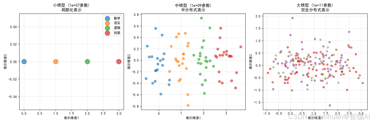 plt.rcParams['axes.unicode_minus'] = Falseclass DistributedRepresentationAnalysis:"""分布式表示与涌现能力的关系分析"""def analyze_representation_emergence(self):"""分析表示学习的涌现过程"""# 模拟不同规模模型的表示能力model_scales = {'small': {'params': 1e7, 'representation': 'localized'},'medium': {'params': 1e9, 'representation': 'semi_distributed'}, 'large': {'params': 1e11, 'representation': 'fully_distributed'}}# 概念表示的演化concepts = ['数学', '语言', '逻辑', '创意']plt.figure(figsize=(15, 5))for i, (scale, info) in enumerate(model_scales.items()):plt.subplot(1, 3, i+1)# 模拟概念在表示空间中的分布if info['representation'] == 'localized':# 小模型:概念分离for j, concept in enumerate(concepts):plt.scatter([j], [0], s=200, label=concept, alpha=0.7)plt.title(f'小模型 ({info["params"]:.0e}参数)\n局部化表示')elif info['representation'] == 'semi_distributed':# 中模型:概念开始关联np.random.seed(42)for j, concept in enumerate(concepts):x = j + np.random.normal(0, 0.3, 20)y = np.random.normal(0, 0.3, 20)plt.scatter(x, y, s=50, label=concept, alpha=0.6)plt.title(f'中模型 ({info["params"]:.0e}参数)\n半分布式表示')else:# 大模型:完全分布式表示np.random.seed(42)colors = plt.cm.Set1(np.linspace(0, 1, len(concepts)))for j, concept in enumerate(concepts):# 每个概念分布在多个区域for k in range(3):x = k + np.random.normal(0, 0.5, 15)y = np.random.normal(0, 0.5, 15)plt.scatter(x, y, s=30, color=colors[j], label=concept if k==0 else "", alpha=0.6)plt.title(f'大模型 ({info["params"]:.0e}参数)\n完全分布式表示')plt.xlabel('表示维度1')plt.ylabel('表示维度2')if i == 0:plt.legend()plt.grid(True, alpha=0.3)plt.tight_layout()plt.show()# 运行表示分析