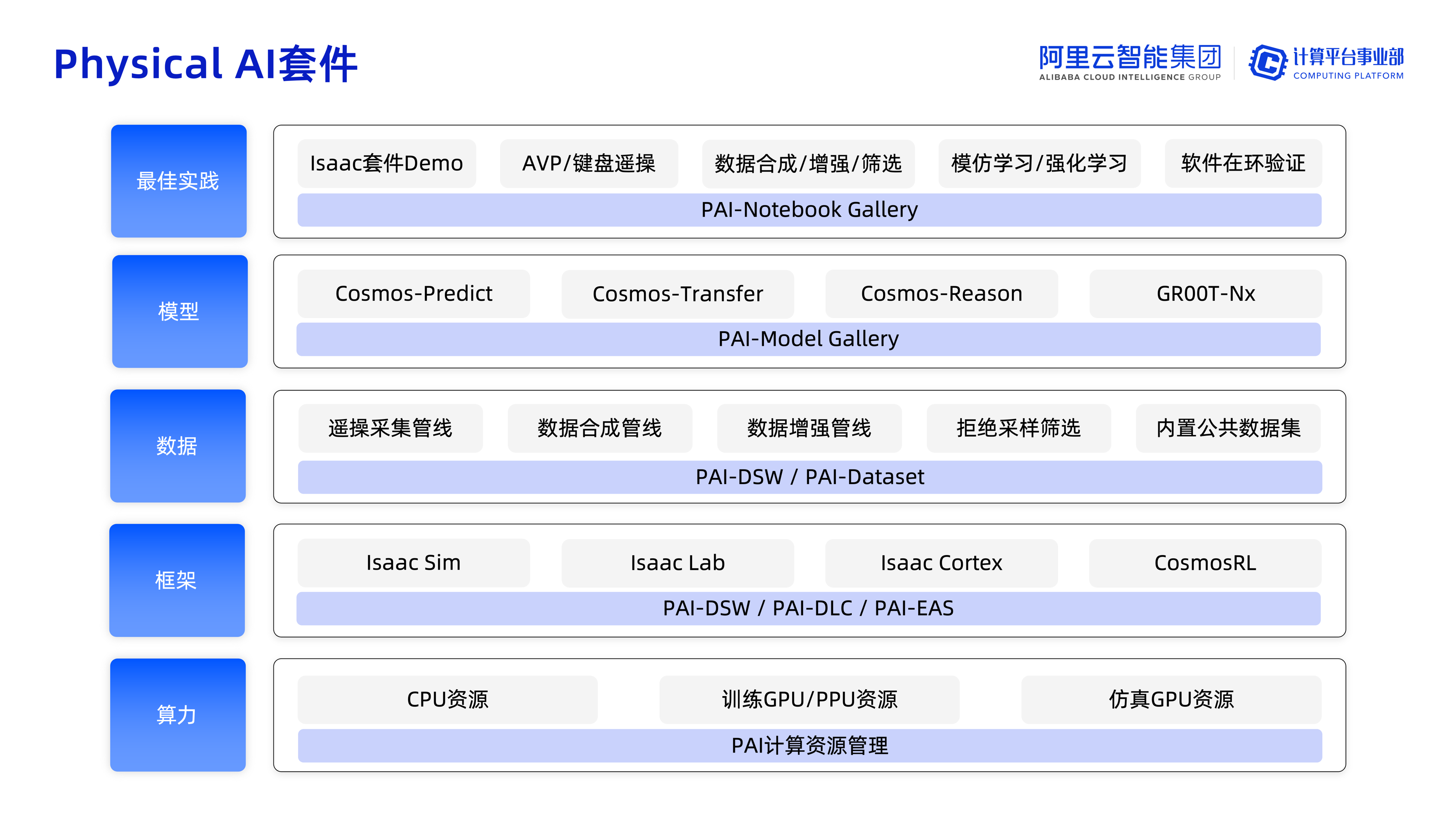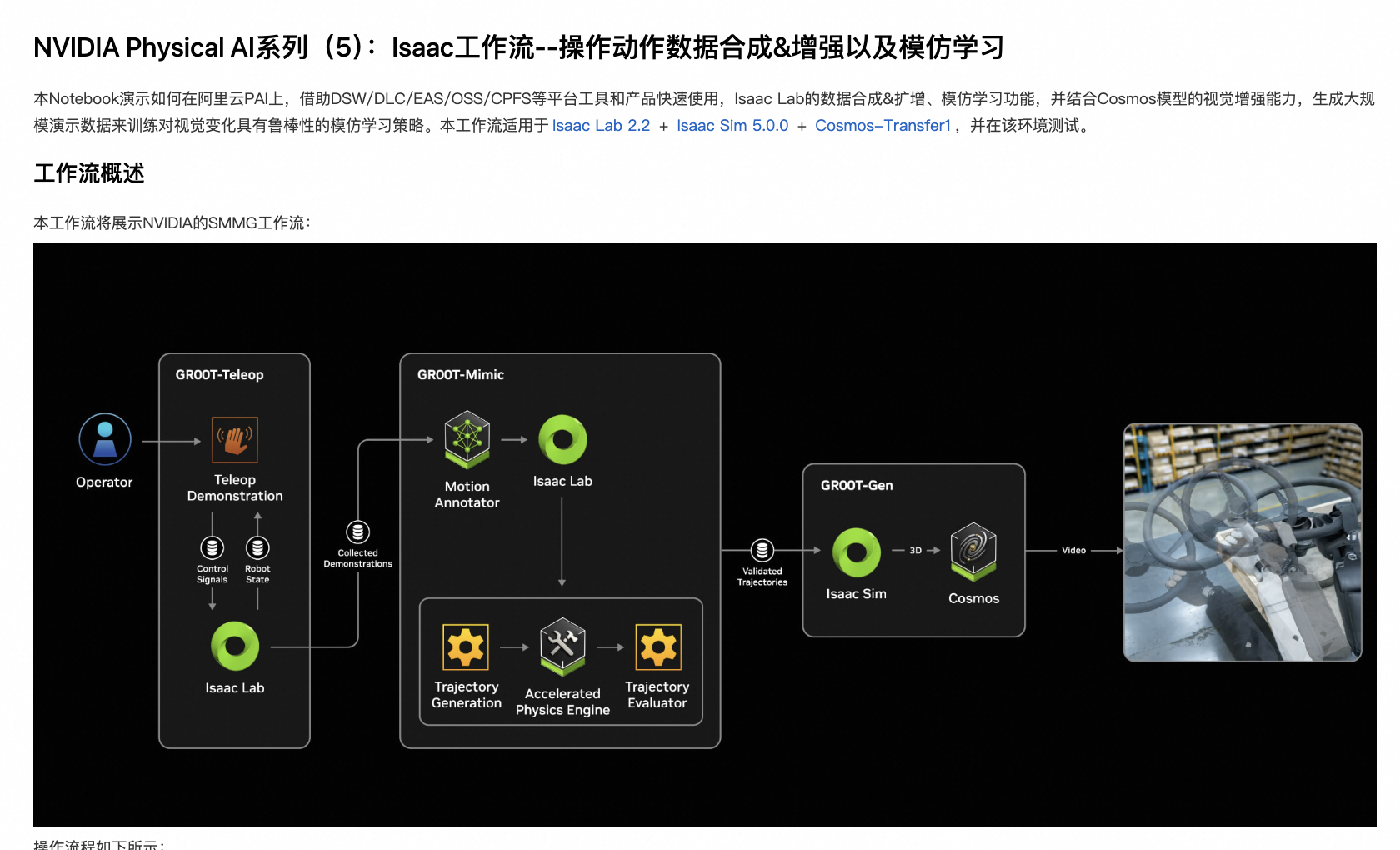 基于和NVIDIA Physical AI套件的深度整合,阿里云PAI人工智能平台整合了上述全套工具栈,并在Notebook Gallery中上线了多套开箱即用的最佳实践,供开发者熟悉技术、快速启动Physical AI项目使用。