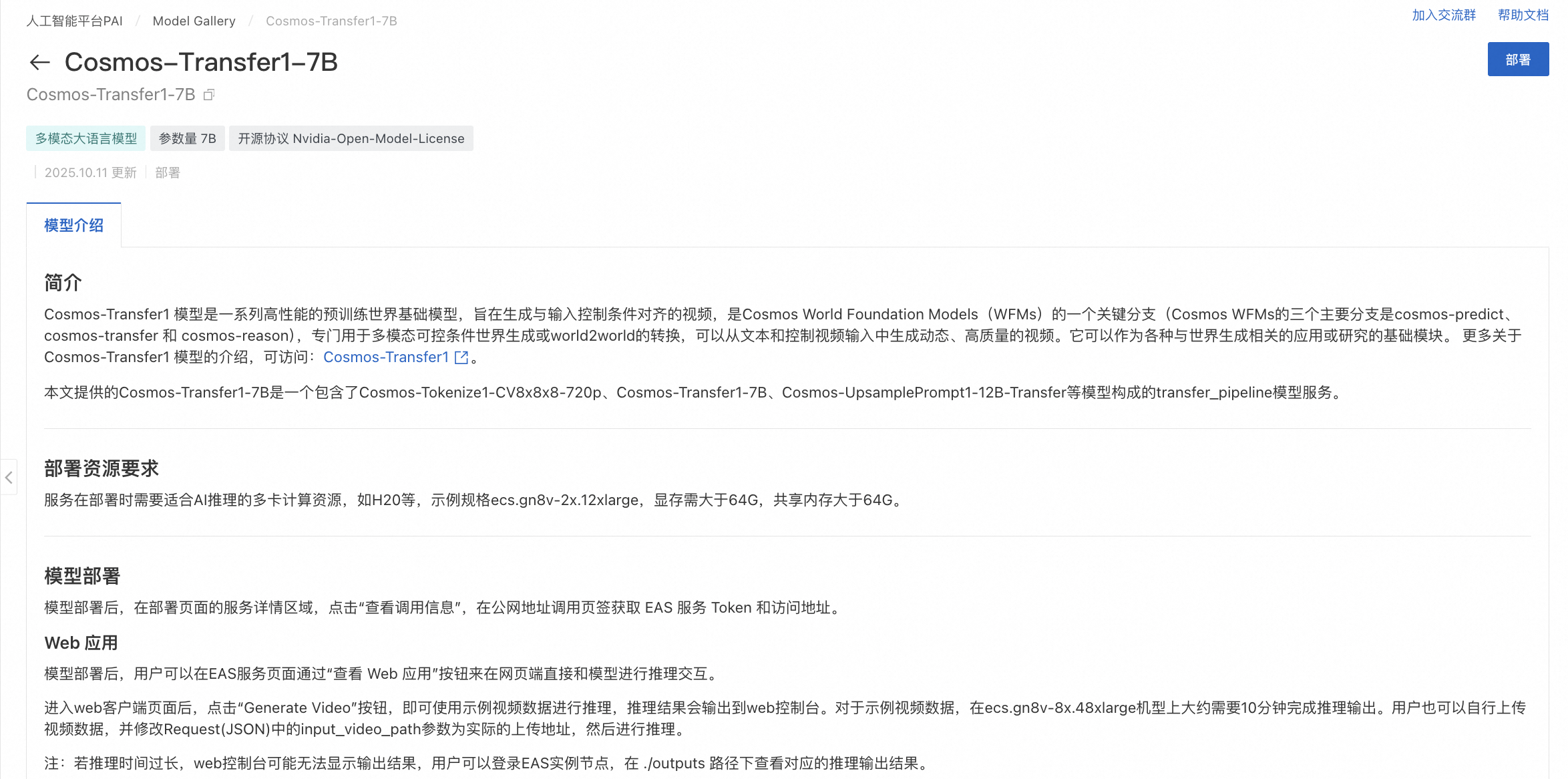 首先在Model Gallery中找到cosmos-transfer1-7b模型并将其部署: