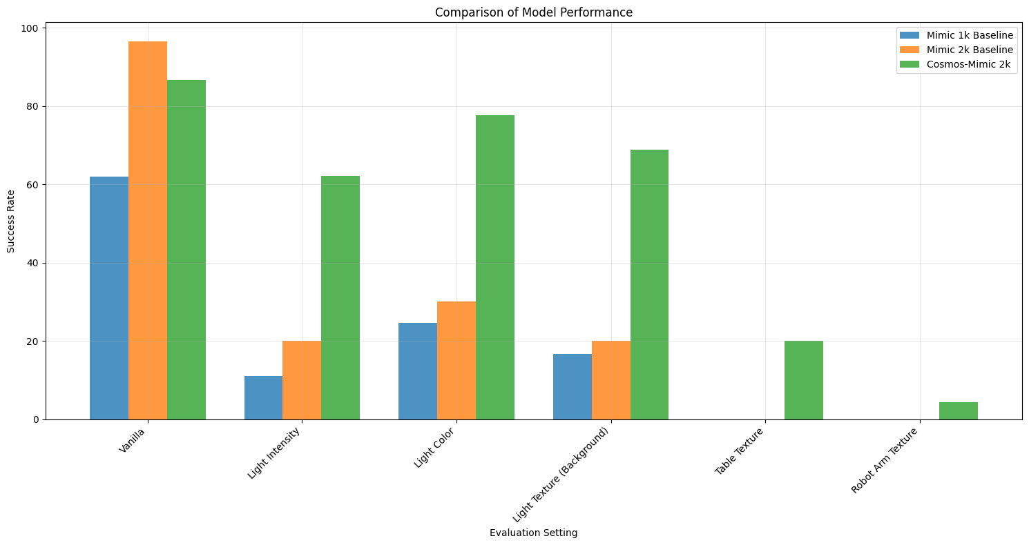 Cosmos 数据增强后的训练模型在各个场景下的成功率均有较高提升,这一工作流程为具身智能的机器人视觉操作提供了一套完整的技术解决方案,在 sim2real 的训练过程中提高了模型在复杂视觉环境下的泛化能力。