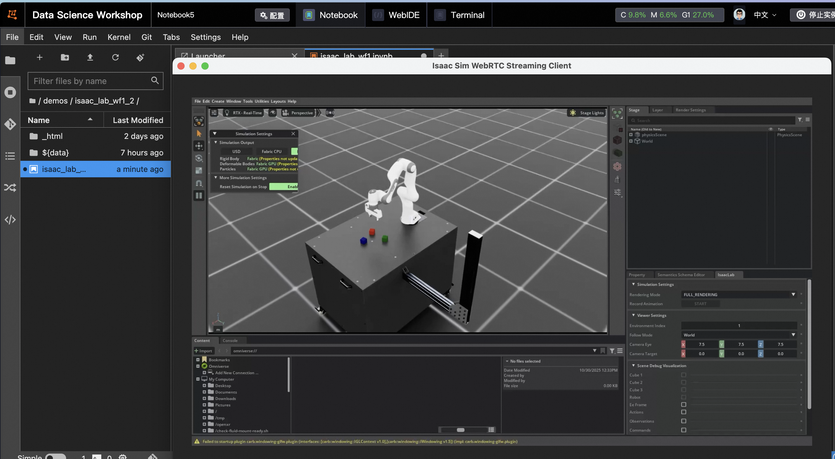 在本最佳实践中,我们基于MimicGen进行数据扩增,而MimicGen需要仿真环境提供的真值数据,因此我们在Isaac Lab仿真环境下采集人工演示。以下是在DSW中启动Isaac Lab仿真环境的一个样例: