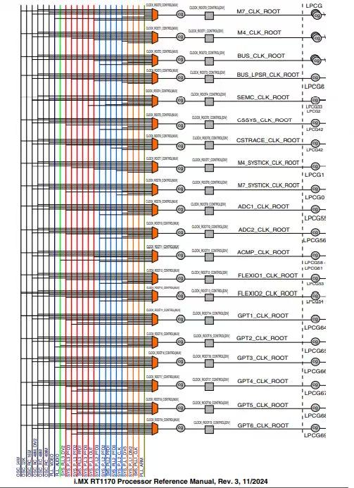 OSCPLLn_DIRECT寄存器(PLL / 振荡器需在 GPC 模式下工作)。仅当通过信任区认证后,这些寄存器才可在未分配模式下访问;在 CPU 低功耗模式或设定点模式下,这些寄存器无效且不可写入。时钟根:时钟根配置来自