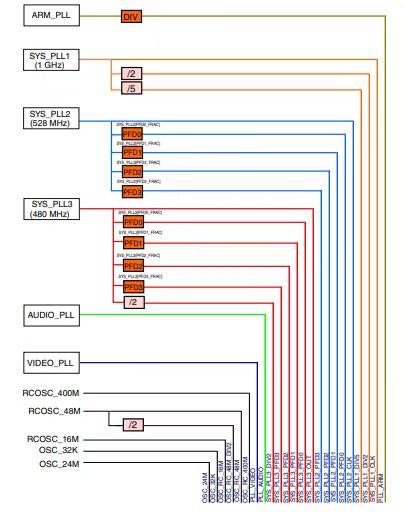 - 振荡器(Oscillators):提供基础时钟源,例如24MHz 外部晶振(OSC_24M)、400MHz 内部高速振荡器(OSC_RC400M)。