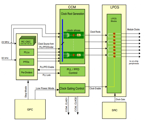 时钟控制模块(CCM)负责管理片上模块时钟。振荡器、锁相环(PLL)和相位分数分频器(PFD)将生成固定或可变频率的时钟源。