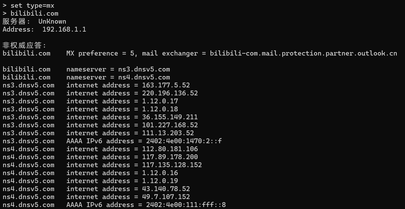 参考:应用nslookup命令查看A记录、MX记录、CNAME记录和NS记录_ns记录查询-CSDN博客