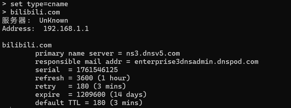 输入set type=cname,再输入域名,可查询CNAME记录