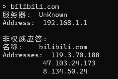 在提示符>后直接输入域名,可查到该域名的A记录(也可以用set type=a指令设置)