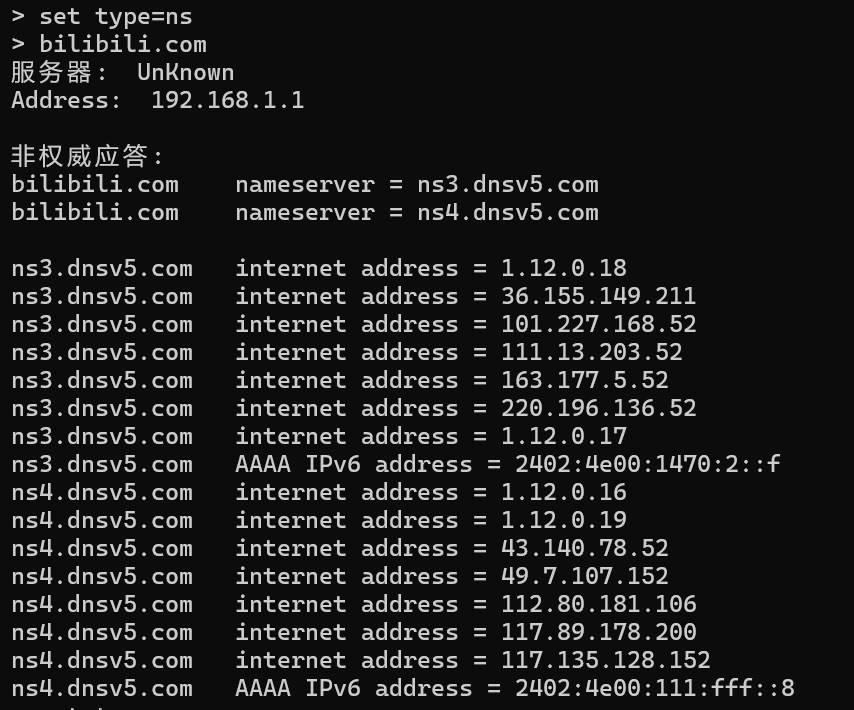 输入set type=ns,再输入域名,可查询NS记录。