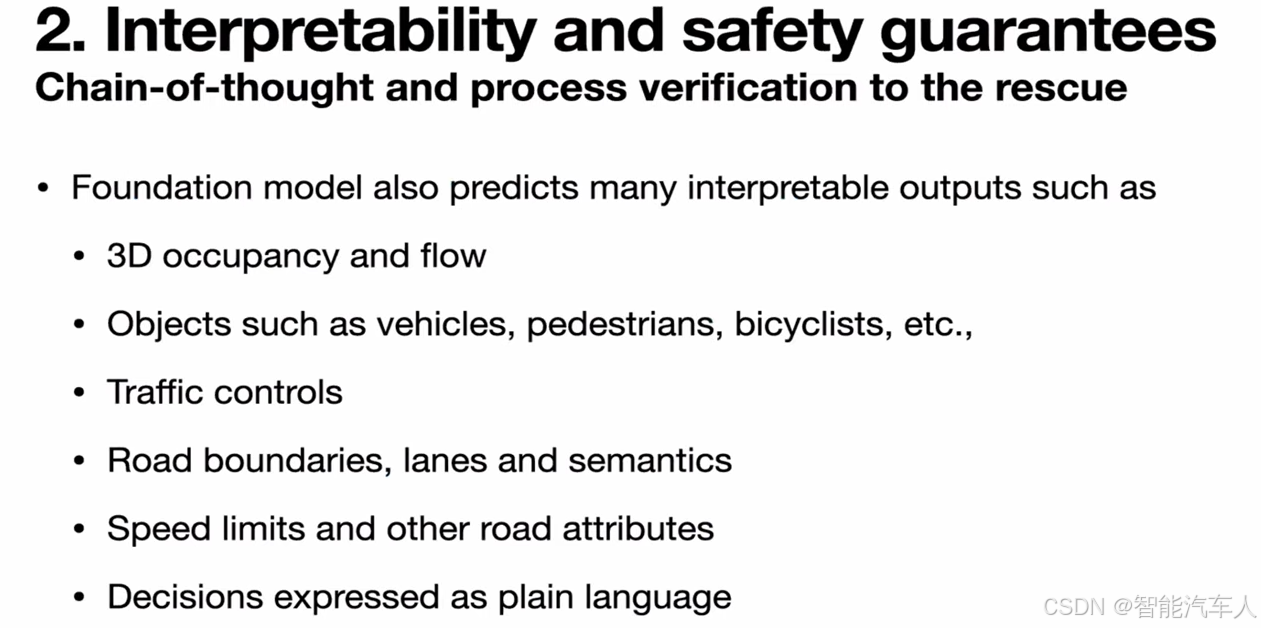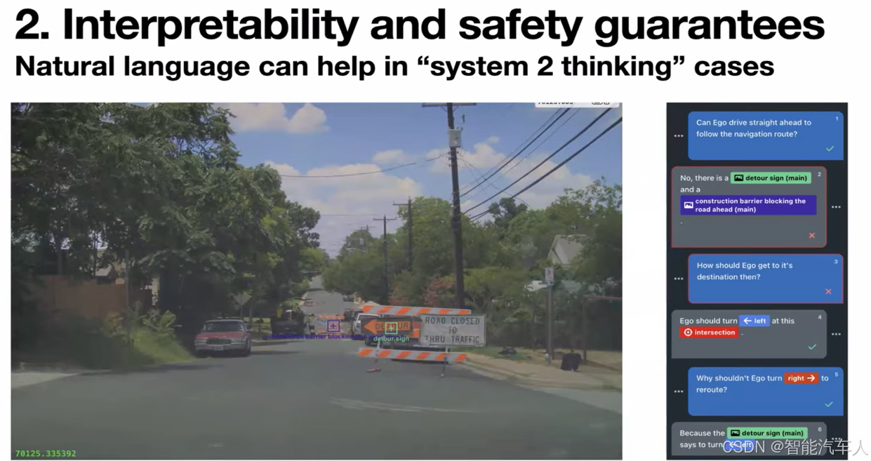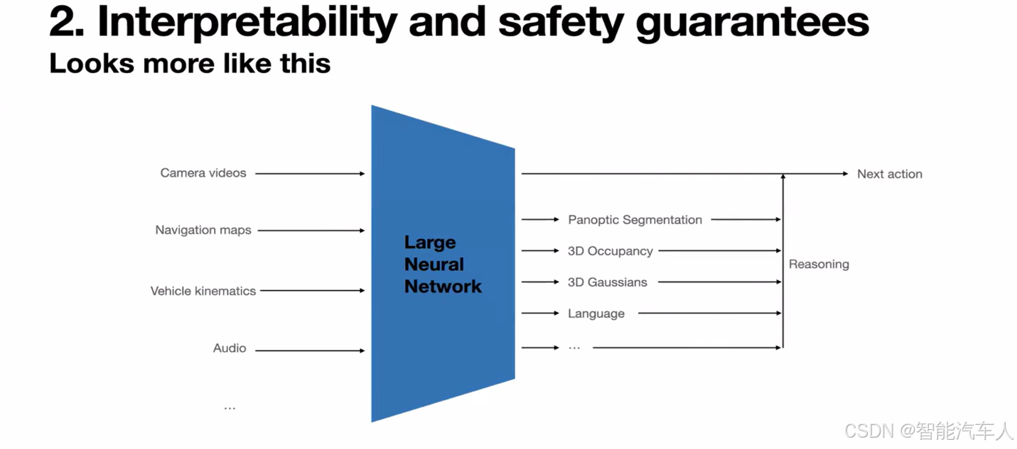 其次,你可能会问这是一个端到端系统,你们怎么调试呢?你们到底是如何知道开发这个东西的? 如果出了问题,你们怎么知道?仅仅因为它是一个端到端系统,并不意味着它不能预测任何其他东西。同一个模型可以被提示(prompted)去预测任意事物,包括 3D 占用(3D occupancy)、其他物体、交通信号灯、交通标志、道路边界。甚至只是用语言。你可以问它为什么做出了某些决定,它是否理解这个场景,等等?所有这些都有助于解释模型对场景的理解,也在某种程度上为整个系统的安全性提供一些保证。