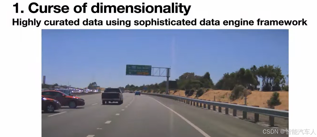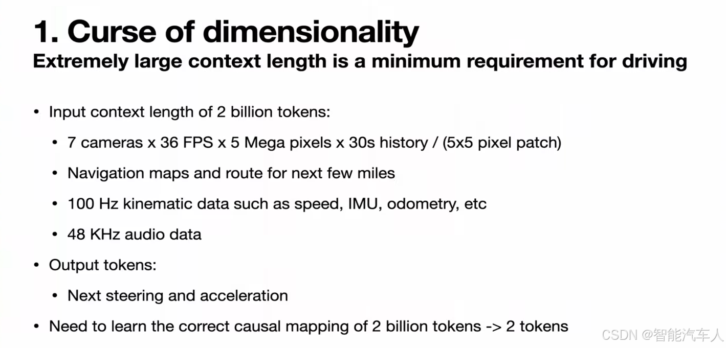 首先是维度灾难(curse of dimensionality)。输入的上下文是相当庞大的,尤其是我们的车,根据车型的不同,有 7 个或 8 个摄像头。每个摄像头都会产生500 万像素的摄像头视频流,以高帧率运行。即使你想要大约 30 秒的上下文或类似的东西,再加上其他必要的输入,比如路线、车速和其他运动数据,它输入可以轻松超过几十亿的 token,比如 30 秒的上下文窗口就需要 20 亿个 token。而如果我们天真地只使用某种一个巨大的 Transformer,这将是一个非常困难的任务,即把 20 亿个 token 映射到大约 2 个 token。这 2 个 token 就是汽车应该采取的下一个转向和加速。