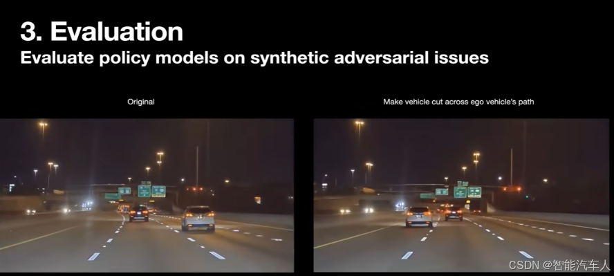 在这种情况下,左侧的原始视频,那辆车只是在它自己的车道上向前行驶。但在右侧,我们可以条件化(condition)这辆车,让它横切过我们的路径,然后注入这种对抗性事件(adversarial event),以测试系统的极端案例(corner cases)。你可以看到,视频场景和场景的其余部分保持一致。