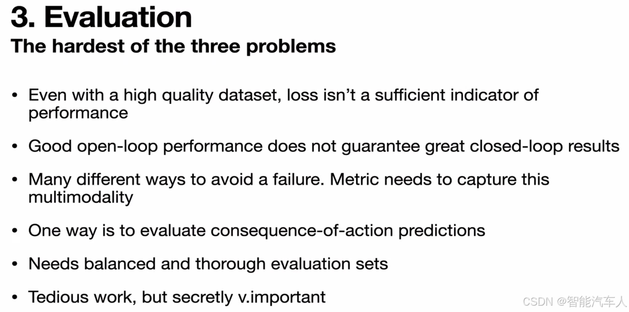 这有很多原因, 我不想在这里深入探讨细节,但它确实是一个非常重要的问题,需要大量的关注才能从系统中获得好的、好的性能。它还需要一个详尽的评估集。不只是从你的车队中随机采样数据,大部分将是无聊的高速公路驾驶数据,你不想只是在评估高速公路驾驶。这就是我之前提到的数据引擎方法派上用场的地方,我们可以构建一个平衡的、完全覆盖的评估集,这工作极其重要,但非常繁琐。