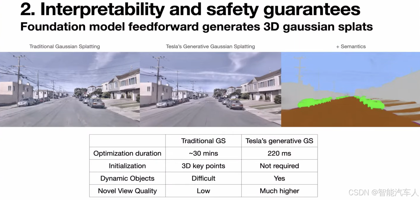 但我们在中间这一列展示的是特斯拉版本的高斯溅射,同一个模型可以产生高斯。在与左侧相同的、有限的摄像机视角下,特斯拉的泛化能力要好得多。如第三列所示,它还可以产生语义(semantics)。