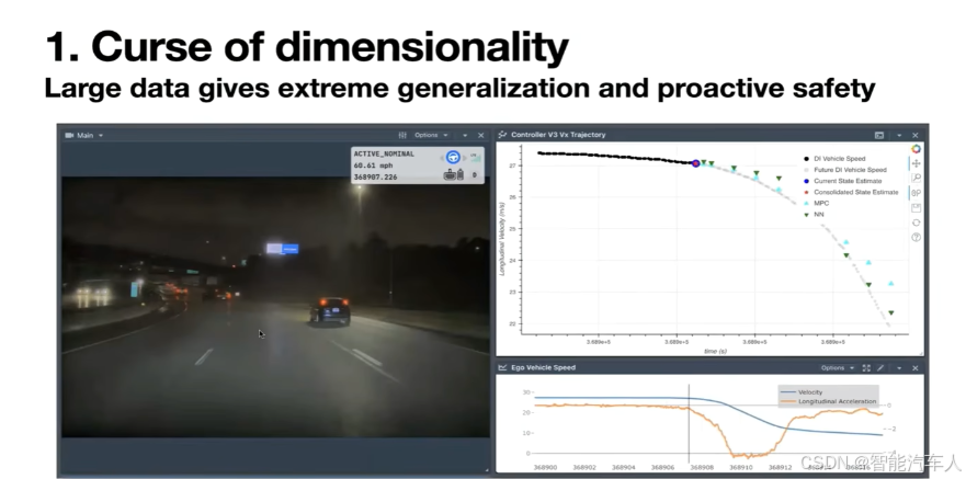 这就是你如何能同时提供安全又平稳的驾驶体验,因为一个不够智能的系统会等到对向改变了,或者某些坏事已经发生了才会反应。 刹车发生在真正出问题之前的好一会儿。 这就是你通过端到端系统和海量数据所能得到的。