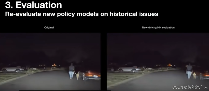 此外,你可以拿来过去的问题(如上图所示),比如拿一个一年前的问题,然后你可以重新运行最新的神经网络,看看它们的表现会如何。 这里的左侧是最初的失败案例,车辆可能离行人有点太近了,然后在右侧,我们正在评估一个新神经网络来驾驶这辆车。 你可以看到,新策略在行人一从车后出现时,就更早地开始偏移车辆。