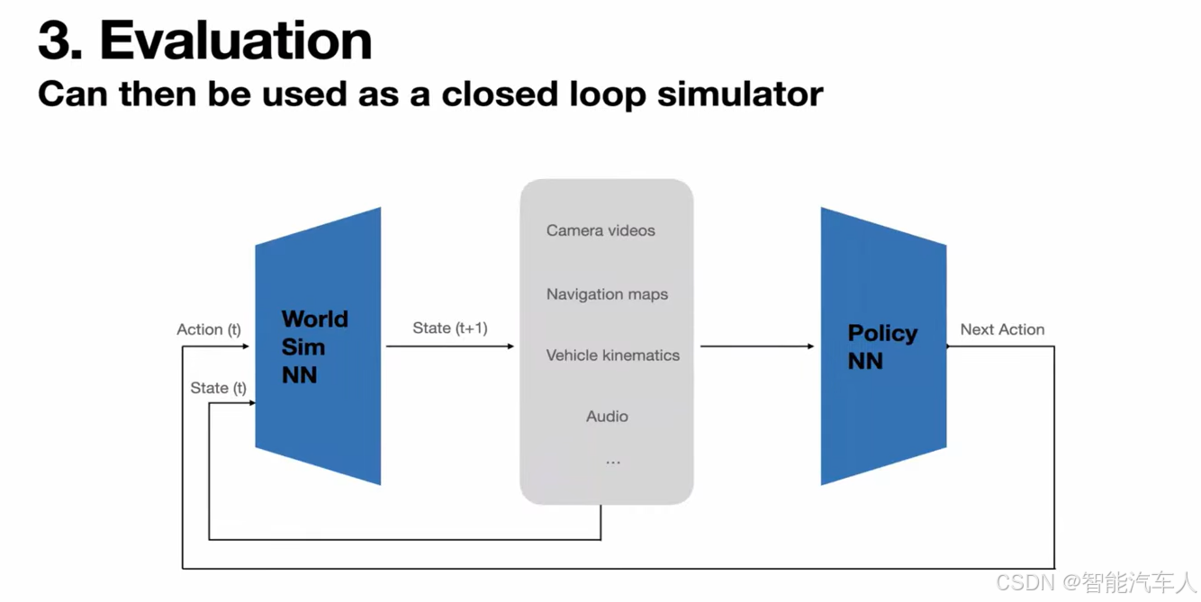 这三个问题中最困难的就是(闭环)评估。 如果你只是从驾驶员那里训练了一堆数据,然后训练模型,并只是扩大它,你的开环性能可能看起来很棒,但它可能无法很好地转化为汽车的实际驾驶表现。