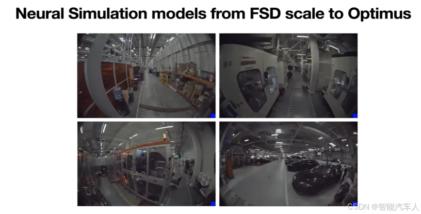 特斯拉制造人形机器人,我们称之为 Optimus(擎天柱)。我们在这里为自动驾驶开发的相同技术,也可以无缝地转移到其他形式的机器人上。我将在这里展示一个例子,就像,视频生成技术也适用于Optimus。所以这是 Optimus 在特斯拉工厂里导航。所有这些都是生成的视频。 你可以看到它们都非常一致。你也可以,就像我们对汽车所做的那样,对它进行动作条件化(action-condition)。所以这里左上角是机器人径直往前走。这是地面真实情况(ground truth),但你可以有不同的动作,比如向左、向右或某个其他方向。然后模型可以为这些动作正确地生成像素画面。并且这是同一个神经网络,只是添加了一些来自 Optimus 的更多数据,它就泛化到了其他的机器人形态因子(form factors)上。